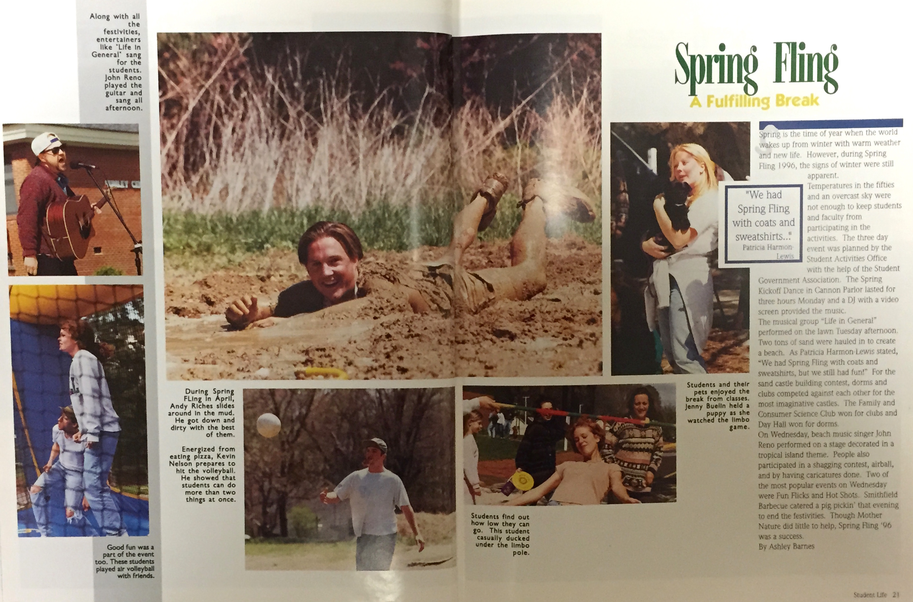 This Thursday we are taking you back to Campbell’s Spring Fling in 1996. So what was going on around campus during Spring Fling 19 years ago? Campbell students enjoyed several events similar to the ones hosted this week by the Campus Activities Board (CAB). Unlike Spring Fling this year, in 1996 Spring Fling was only a 3-day event. To kick things off for Spring Fling 1996, the Student Activities Office hosted the “Spring Kickoff Dance” in Cannon Parlor. Students also engaged in many outdoor activities ranging from volleyball to limbo. One afternoon, students gathered around to listen to the group “Life in General” which performed outside in front of Rumley Center. Despite hauling-in 2 tons of sand to create a makeshift beach, “the signs of winter were still apparent” with overcast skies and low temperatures. But students did not let the cooler weather have an ill effect on their Spring Fling festivities.