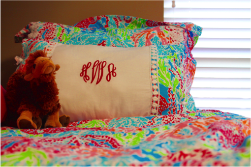 Haley Pleasant, a freshman at Campbell, is a resident in Pat Barker. Her dorm room is character of a true southern belle. It is full of Lily Pulitzer, from the bed spread and pillows to the rug, and nearly everything has a monogram on it. The colors of her room are very bright, cheery, and inviting. Your eyes are immediately drawn, though, to the many pictures strung on the wall. When I asked her about the pictures, Haley said that she “wanted to bring a little piece of home with her.” Above the sink, she has an inspirational quote that reminds her every morning “to follow your arrow wherever it points.”
