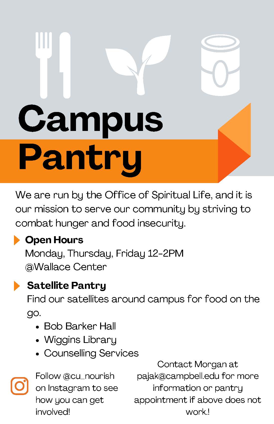 The food pantry has moved from the Campus Ministry House to a newly renovated space (the old burger studio) in the Wallace Center. The food pantry is open to staff and students who might need an extra meal or some food supplies. They are open Monday, Thursday, and Friday from 12-2 PM.