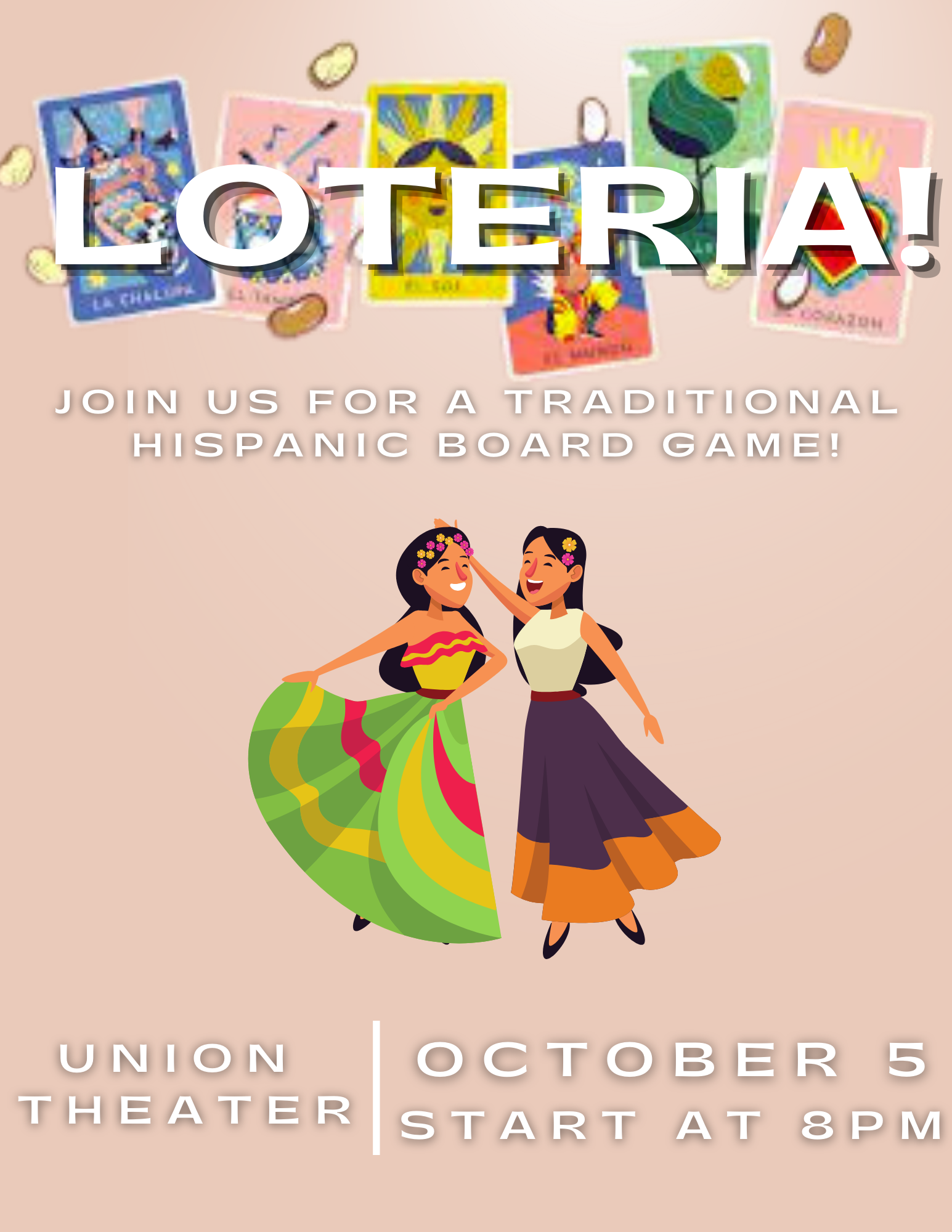 Loteria Board Game Night: On October 5th at 8pm located in the Student Union Theater (on the 2nd floor next to the smoothie shop). CAB is throwing this event to have students be able to experience Hispanic culture during National Hispanic Heritage Month!