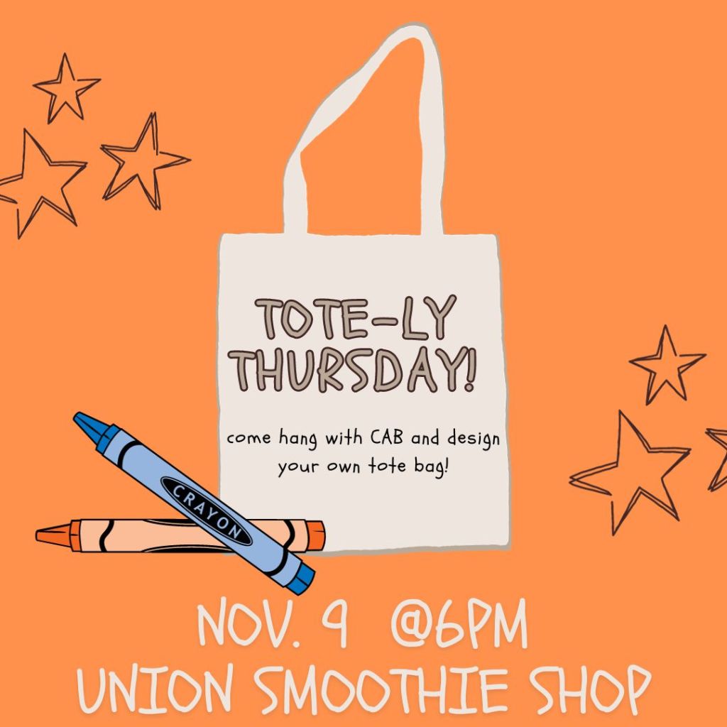 Thursday 11/09: CAB is having an event where students can decorate their own tote bag at 6PM near the Union’s Smothie Shop